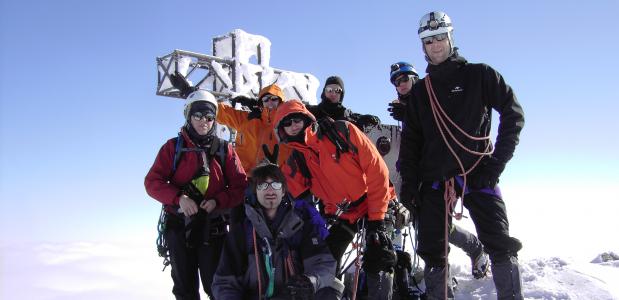 We binden de stijgijzers onder en vatten onze beklimming aan. 700 meter hoger ligt de top. Het is echter bewolkt en het kruis op de top is niet te zien. Het heeft de voorbije dagen erg veel gesneeuwd. Er ligt ruim een meter verse sneeuw en er is helemaal geen spoor. Lachend en genietend van de fysieke inspanning
