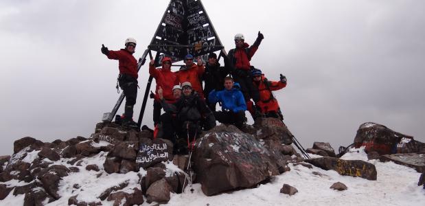Het is nog koud en donker als we de volgende ochtend aanschuiven aan de ontbijttafel. Het was wederom een ijskoude nacht en de thee warmt ons op. De normaalroute naar de Toubkal loopt via de noord oostelijke graat die vertrekt achter de hut. Wij kiezen echter voor de noordelijke variant en willen eerst de Tiberhine (3880m) en de Imouzzer (4010m) beklimmen om vervolgens via de noodcol door te steken naar de noordgraat die naar de top van de Djebel Toubkal loopt. Bij de start van de beklimming moeten we ons ritme nog vinden. We binden ons niet in omdat hier geen gletsjers zijn en dat wil zeggen dat iedereen op zijn of haar eigen tempo kan klimmen. Na de eerste 700 hoogtemeters staan we met z’n allen op de top van de Tiberhine. Hier vinden we de wrakstukken van een vliegtuig dat lang geleden crashte op deze berg. We klimmen snel verder om even later op de Imouzzer te staan. Het is aardig koud en er staat een strakke wind. Nadat we de noordelijke col zijn overgestoken moeten we nog 150 hoogtemeters overwinnen naar de top van de Toubkal zelf. Een half uur later staan we op de top. In dit moslimland staat er uiteraard geen kruis of een Mariabeeld op de top, maar wel een metalen pyramide die het hoogste punt van Noord-Afrika aanduidt. Van hieruit hebben we een mooi 360° graden zicht op de omgeving. In het noorden zien we de groene vallei van Imlil en Asni. In het westen zien we de sneeuwcouloir die we gisteren beklommen hebben. Het zuiden en het oosten kijken uit over de woestijn. Na de verplichte topfoto’s beginnen we aan de afdaling. We besluiten om van de geplande route af te wijken om zo ook nog de Toubkal West (4030m) te beklimmen. Onze zesde bergtop op 2 dagen.