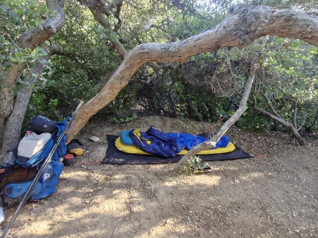 Toen ik de eerste klim van de dag er halverwege de ochtend op had zitten, werden de lange grashalmen en bloemen aan de andere kant van de berg afgewisseld met bomen en de alomtegenwoordige chaperralstruiken van Zuid-Californië. Aan het eind van de ochtend aangekomen bij een watercache langs een autoweg, kwam ik een hoop hikers tegen die hier genoten van de schaduw onder een grote boom. Ik besloot hier gezellig bij aan te sluiten om mijn watervoorraad aan te vullen, te lunchen en het warmste punt van de dag uit te zitten. Rond 15:15 besloot ik verder te lopen naar mijn geplande tentplaats die zo'n 9 kilometer verderop lag. Warm was het nog zeker, maar het was in ieder geval iets kouder dan het begin van de middag.