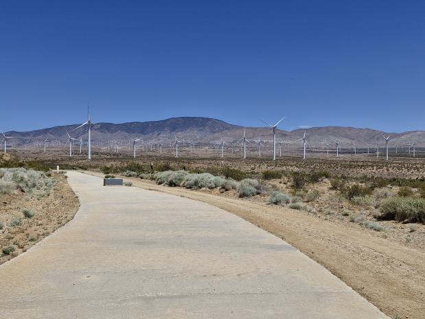 Terwijl de zon verder boven de horizon kwam, werd het landschap weidser en weidser. Door de vlakke bodem van de Mojavewoestijn konden we ontzettend ver kijken en zagen we de bergen in de verte achter de horizon verdwijnen. Behalve wat struiken en de bijzondere Joshua trees stak er om ons heen nauwelijks iets boven de grond uit. Totdat we de eerste windmolens tegenkwamen. Vanwege de onaflatende wind in de woestijn kan er hier een hoop energie worden opgewekt. In combinatie met de velden zonnepanelen die we zagen worden de omstandigheden hier optimaal benut.