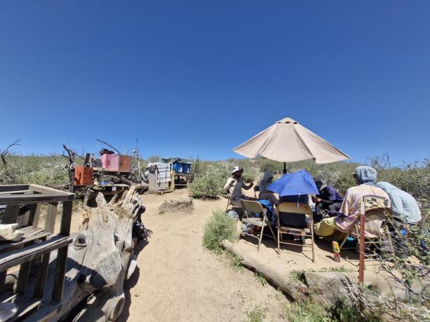 De volgende ochtend stond ik weer vroeg op om op tijd te beginnen aan de onbeschutte etappe die voor me lag. In de eerste uren van de dag voerde de trail me over westelijke hellingen, waardoor de opkomende zon me voorlopig gespaard bleef tijdens de lange en geleidelijke klim. Ik steeg verder en verder uit boven de uitgestrekte leegte van de woestijn in het zuiden en liep halverwege de ochtend van de ene bergtop naar de andere. Hier was nauwelijks beschutting te vinden tegen de zon, dus ik was blij dat de komende watercache een parasol had. Samen met de andere hikers die zich hier verzameld hadden genoot ik van de schaduw. Terwijl we onder de parasol zaten kwam de trailangel die de watercache onderhield aanrijden op de naastgelegen zandweg. Hij gaf ons koude frisdrank, sinaasappels en chips. Mijn dankbaarheid voor de hulp en mooie gebaren van trailangels is door dit soort momenten bijna niet in woorden uit te drukken.