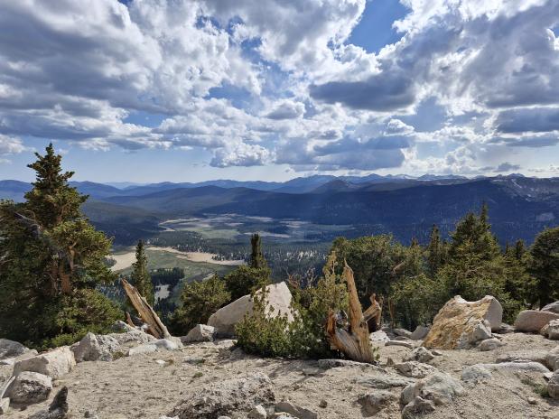 De rest van de ochtend liep ik afwisselend door bossen van naaldbomen en open hellingen met uitzichten over uitgestrekte dalen en hoge bergen. Tijdens de lunch pauzeerde ik samen met Chaps, Stats, Beku en Spam. Daarna begon ik aan de laatste maar pittige klim van de dag. Tegen de avond werden de uitzichten steeds mooier met de ondergaande zon en kon ik ver kijken over de verwoestijnde Owens Valley in het noorden. De ooit groene vallei is grotendeels droog komen te staan door het Los Angeles Aquaduct, waar ik in de Mojavewoestijn nog langs liep. Ik moest nog een klein stuk lopen naar mijn volgende kampplaats bij een zijpad naar een bron in een idyllische weide. Snel haalde ik water voor het donker werd en at ik samen met Claire, Ben, Steffie, MVP en Squeak. Mijn tent had ik nu op een hoogte van bijna 3200 meter opgezet.