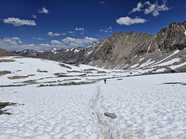 De wekker stond om 05:00 uur zodat ik kon vertrekken terwijl de sneeuw op zijn hardst was. Voor en vooral na de pas lagen namelijk grote sneeuwvelden. Mijn schoenen waren nog nat, maar ze zouden tijdens het lopen voorlopig toch niet opdrogen. Terwijl de trail me geleidelijk omhoog leidde lag er steeds meer sneeuw en ijs, waardoor het soms onduidelijk was waar de PCT precies liep. De 70-jarige Turbo Joe uit San Diego volgde me om deze reden richting de pas. Door de voetstappen in de sneeuw te volgen en navigatieapp FarOut in de gaten te houden, werkten we ons voorzichtig een weg omhoog. In de pas aangekomen kwam ik Lippy, Ash en wat andere hikers tegen. Hier hadden we een spectaculair over een sneeuwwitte wereld van bergtoppen en ijsblauwe meren.