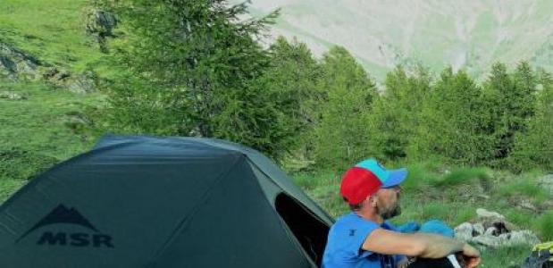 Mijn tweede bivakplaats was op een col nabij Refuge Bertone op zo’n 2000 meter hoogte. Onderweg hier naartoe liep ik voorbij een waterpunt, een houten bak waar bergwater in stroomt. Ik besloot nog even water bij te tappen voordat ik verder zou gaan. Ik zag twee mensen bij een huisje staan en vroeg hen of zij nog een mooie bivakplaats wisten, maar hier wisten zij geen antwoord op te geven. Zij vertelde wel dat ik wellicht tegen betaling zou kunnen douchen. Waarop ik dacht dat zij mij iets duidelijk wilden maken. Ik zei dat dat niet nodig was en lachend namen wij afscheid.