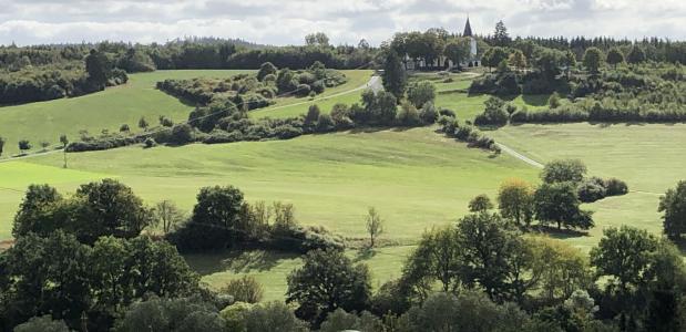 We lopen over paden langs Schotse hooglanders en zonnebloemvelden door het glooiende landschap van de Vulkaneifel. In de verte hebben we een prachtig uitzicht op de Hilgerather Kirche, dat bij het plaatsje Neichen hoort. In Neichen stuiten we op één van de Sauerbrunnen die zich op het Lieserpfad bevinden. Bij de aangelegde pauzeplaats kun je water drinken dat rechtstreeks uit de vulkanische aarde komt, voor drinkbekertjes is gezorgd. Wij wagen ons er ook aan, maar het zure ijzer- en koolzuurhoudende water kan ons niet echt bekoren. Gelukkig hebben we onze eigen voorraad water meegenomen.