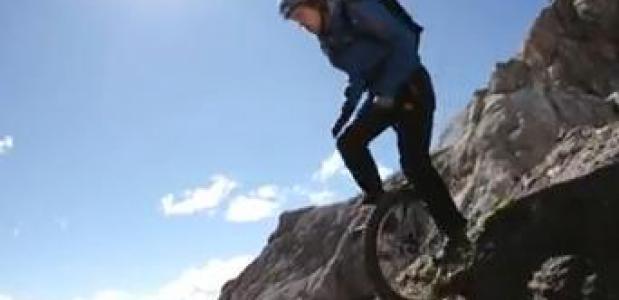 Met één hand aan het zadel en één hand in de lucht voor het evenwicht. Zo gingen Stephanie Dietze en Lutz Eichholz op hun eenwieler van de 3011 meter hoge Cima Ombretta Orientale in de Dolomieten (Marmolada-groep).
