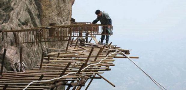 In ieder geval ziet het er erg spannend uit, de mannen die een wandelpad aan het bouwen zijn op de Shifou berg in Zuid-China. Het wordt een 3 kilometer lang wandelpad dat langs de rotswand loopt, op een paar duizend meter hoogte.