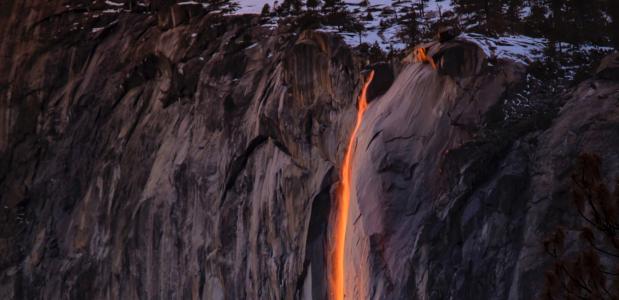 Elk jaar trekken in februari veel natuurliefhebbers naar Yosemite National Park in de Amerikaanse staat Californië om daar de van een bijzonder natuurspektakel te genieten. Rondom de avondschemer kleurt het water van de waterval Horsetail Fall namelijk feloranje. Alsof er een stroom lava van de bergwand af stroomt. Het verschijnsel staat bekend als ‘Firefall’.