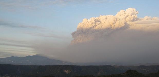 De vulkaan hield zich de afgelopen twee weken rustig maar begon zondag weer met het spuwen van as en stenen. Die vlogen tot wel vier kilometer hoog de lucht in.