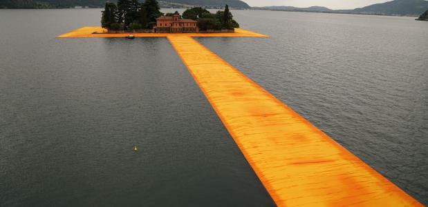 Het kunstwerk was een creatie van de beroemde kunstenaar Christo, die op 31 mei 2020 overleed. Hij staat normaal bekend om de gebouwen die hij inpakt. Dit keer pakte hij geen gebouw in, maar legde een grote drijvende dam aan. Deze ‘Floating Piers’ verbinden het dorpje Sulzano met het Monte Isola. Ook een deel van Sulzano zelf is geïntegreerd in het kunstwerk. Zo meet de route over land en water bij elkaar bijna vijf kilometer.