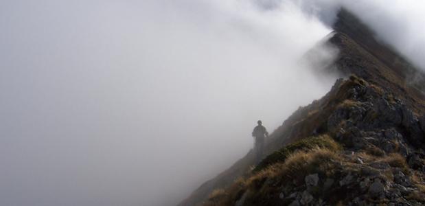 We merken beide dat het weer wat betrekt en de temperatuur daalt. Met fleece handschoenen aan wordt even later de tocht over de graat voortgezet. Wanneer we dan ingehaald worden door nevelflarden terwijl de zon nog steeds haar best doet slaat de verbijstering toe. Zie jij ook wat ik zie Rob? De eigen schaduw omkranst door een regenboog doet me verstommen. Ik pak mijn camera, beweeg wat naar links en …weg is het weer.