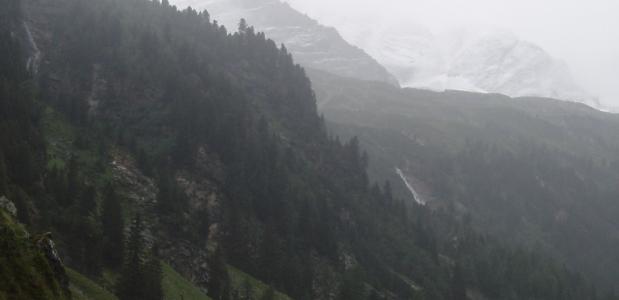 Na vier uur wandelen, is het eindelijk even droog. Ik ben net voorbij Padaun en ik zie rechts van me een kudde dieren grazen. Gemzen heb ik deze vakantie al eerder gezien, maar nog niet eerder zo laag. Aan het einde van de geasfalteerde weg gekomen, besluit ik mijn wandelstokken er weer bij te pakken. Al wandelend schuif ik mijn stokken tot de goede hoogte uit. Plotseling staat er op nog geen vijf meter afstand een gems naar me te kijken. Ik sta stil en ik verwacht dat hij nu wel snel naar het bos zal vluchten.