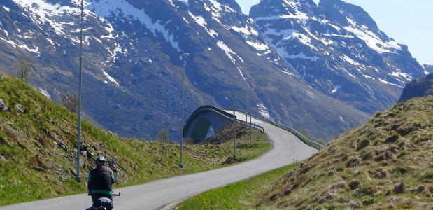 Het fietspontje van Ballstad naar Nusfjord vaart pas vanaf 15 juni dus wij zijn door de tunnel gefietst die Vestvågøya met Flakstadøya met elkaar verbindt. Dit is op zich goed te doen.