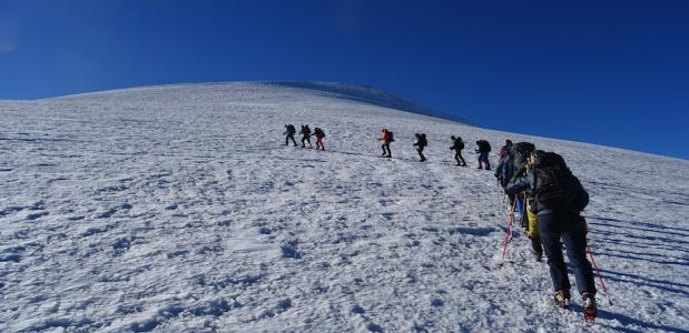 Het weer was perfect, bijna geen wind, niet te koud ( -6°) bij een wolkeloze sterrenhemel! De lichtjes van de omringende dorpen verlichtten het dal en het duurde niet lang of de gloed van de opkomende zon liet andere bergen (vulkanen) verschijnen. Zigzaggend over de lavarotsen klom de groep gestaag richting de sneeuwgrens om daar de stijgijzers aan te binden en de ijsbijl ter hand te nemen.