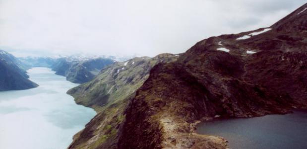 Halverwege de middag bereiken wij de top van de Beseggen. Een smalle bergkam waarover je van 1638 meter hoogte in korte afstand afdaalt naar ongeveer 1400 meter. En als je bovenaan staat heb je een schitterend uitzicht. Rechts zie je het meer Bessvatnet op 1373 meter en links het meer Gjende op 984 meter. Daartussen een smalle bergkam die beide meren van elkaar scheidt.