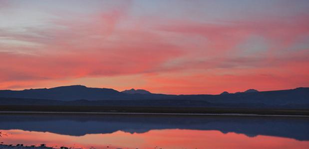 Deze prachtige zonsondergang is bovenop een van de bergen in de Chili woestijn. De grote uitstekende rotsen en de lage heuvelachtige bergen vormen een perfecte ondergrond voor de bloedrode zonsondergang. De Atacama woestijn wordt ook wel de vallei van de maan genoemd. Deze woestijn is de droogste plek op aarde en is een van de weinige plekken waar helemaal geen leven voorkomt. Het mooiste moment ontstaat wanneer de toeristen verdwijnen en de zon achter de zandduinen begint te schuilen.