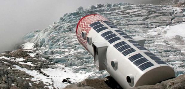 De geavanceerde technologie maakt het mogelijk deze constructie te bouwen op grote hoogte en in extreme weersomstandigheden De bivak ligt dan ook op een rots in het midden van een gletsjer, maar is door zijn rode kleuren aan de voorzijde makkelijk van ver te zien.