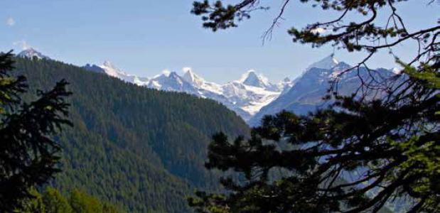 Het startpunt van onze wandeling, het Crêt du Midi, ligt net boven de boomgrens. Daarom hebben we hier al een waanzinnig uitzicht over de vallei en de hoge tweeduizenders om ons heen, waaronder Mont Noble, Mont Gautier en de hoekige La Maya in de verte. Het voormalige muilezelpad loopt slingerend door het grasland, waar we een paar steenbokken ontwaren. “Als we stil zijn kunnen we dichterbij komen en zien we vast nog meer dieren”, zegt gids Pascale Haegler. Een sneeuwhoen vliegt voorbij, later een notenkraker.