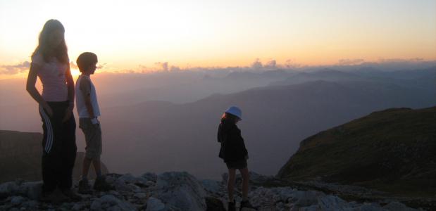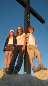 Op de top vergapen we ons aan het geweldige uitzicht; kan het nog weidser? De dag eindigt bij een hut op een soort hoogvlakte. We hebben inmiddels de ruige rotsen achter ons gelaten en zijn beland in de welbekende bergweides met kuddes koeien. Heel spannend voor de kinderen: wie is er nu nieuwsgieriger, de koeien of de kinderen? Na het eten hebben pa en ma een uurtje rust als ik met de kinderen de top van een berg beklim vlak naast de hut.