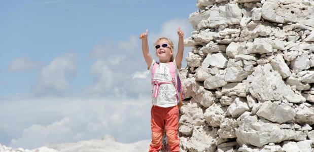 Met Finn weer op mijn rug en Britt voorzien van haar kompas volgen we een bergpad door het rotsachtige maanlandschap naar beneden. Waar de Dolomietentoppen van onderaf scherpe en puntige monolieten lijken, is de top van het Sellamassief behoorlijk vlak. De rafelige randen met spectaculaire afgronden wekken vanuit het dal de indruk van losstaande rotstorens, maar wie er eenmaal bovenop staat, ziet dat de monolieten door een grote stenen vlakte met elkaar verbonden zijn. Britt kan er prima haar weg vinden.