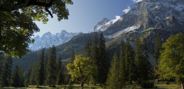We zetten koers naar Engalm, een klein almdorpje op de Grosser Ahornboden. De dalbodem wordt hier niet alleen ingenomen door weilanden en kleine almhutjes. Tussen de weiden en boerenschuurtjes staan talloze esdoornen, welke in de herfst prachtige kleuren aannemen. Op gronden waar vee graast krijgen deze prachtige maar langzaam groeiende bomen nooit de kans om door te groeien. Op de Ahornboden, ooit vernoemd naar deze bomen, is het echter anders gegaan. Een jarenlange oorlog heeft ervoor gezorgd dat de boeren en hun vee de almen links moesten laten liggen. De bomen kregen ondertussen de kans om te groeien en bepalen nu het beeld op de alm.
