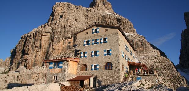 Aangekomen bij de hut zijn wij duidelijk een van de eersten die vanuit ‘onze’ richting zijn gekomen. Echter, deze hut ligt midden op de route van de wereldbekende ‘via Ferrata delle Bocchette’. Dus al onze medelunchers zijn fanatieke klimmers, die deze tocht eenmaal in hun leven gedaan moeten hebben. We zitten aan een tafel met 4 Spanjaarden die net begonnen zijn aan hun huttentocht en, net als ons, overweldigend enthousiast praten over de dolomieten. De speciale vormen, gesteenten en geschiedenis weten ze ons in geuren en kleuren te vertellen. Na de lunch, een heerlijk pasta met een kwartje rode wijn en een litertje gazzata, is het erg aantrekkelijk om eventjes lekker weg te dutten in het zonnetje. We hebben de verleiding weerstaan en na een cafe macchiato toch weer de rugzak opgepakt en onze tocht voortgezet, we zijn immers nog maar op de helft.
