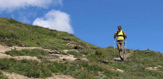 Met kleine pasjes waarbij je je hele voet op de grond zet, ben je al een heel eind. Nu nog volhouden tot je weer beneden bent. Blijf rustig ademhalen, ookal kost je wandeling soms heel wat inspanning. Hetzelfde geldt ook voor je wandeltempo. Hou een rustig en gelijkmatig tempo aan, dan word je het minst snel moe. Raak je buiten adem, of krijg je toch last van bepaalde spieren die al het werk moeten doen? Neem even pauze, kom op adem en kijk daarna of je met een ander tempo of door je voeten nét een beetje anders neer kan zetten die specifieke spieren wat rust kan geven.