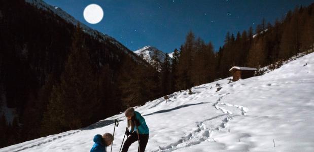 Met volle maan op sneeuwschoenen door een larixbos stappen. Dat kan in Nationaal Park Hohe Tauern in het Oostenrijkse Tirol. Op volle maan nachten in februari en maart, zijn er in Oost-Tirol begeleide sneeuwschoen tochten met astronomie en Tracking.