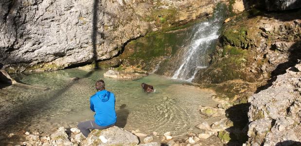We lopen verder omhoog en steken het beekje nogmaals over met een houten brug. In de verte horen we de watervallen al zacht suizen. We komen aan op een open veld met bankjes, een perfecte plek voor de lunch. Na een broodje en een banaan lopen we snel verder. We merken aan de route dat de watervallen steeds dichterbij komen: we steken een aantal kleine bruggetjes over en ook de ondergrond wordt steeds natter. De honden hebben een goed ritme te pakken en zijn lekker op dreef, samen lopen we in een heerlijk tempo naar de watervallen. Daar aangekomen volgen we het pad omhoog. Via de kronkelende paden komen we steeds dichter bij het vallende water. Onderaan de watervallen is een heerlijk rustig plekje, het water klettert prachtig door de rotsen in een klein poeltje waar de honden in het heldere water kunnen zwemmen. Zelf vinden we het smeltwater iets te koud maar pootjebaden is toch heerlijk! Bijna dóór de watervallen lopen paden van stammen en bruggetjes van hout. Boven aangekomen hebben we een fantastisch uitzicht over de watervallen! Als we verder van de waterval aflopen raken we langzaam de bron van de waterval kwijt, dit komt omdat een deel van het water door de spleten en kieren van de berg ondergronds stroomt.
