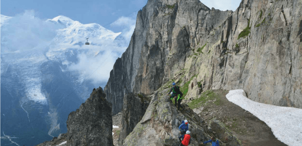 Het Chalet Tissières ligt nabij Chamonix, het bergstadje waar het alpinisme bijna is uitgevonden. Van hieruit is direct zicht op de Mont Blanc en diverse gletsjers die tot diep in het dal doorlopen. Een voor een komen we vanuit Nederland aan bij het chalet waar de gastvrouw ons wegwijs maakt in het basiskamp van onze cursus. De stemming is uitgelaten. We zijn in blijde verwachting van wat komen gaat. De groepsleden had ik al eerder leren kennen. Zeven in getal. In een klimhal in Arnhem hadden we even gesnuffeld aan het echte werk, de wand een aantal keren op en neer. De ervaring liep uiteen. Sommigen hadden al diverse malen op de klimwand geoefend. Voor veel anderen was dit juist de eerste keer. Wat ons bindt is de wil om nu echt het technische werk te gaan doen. Het klimmen, maar ook de gletsjers en uiteindelijk als slotstuk van de week ook de top van een vierduizender: de Gran Paradiso in Italië.